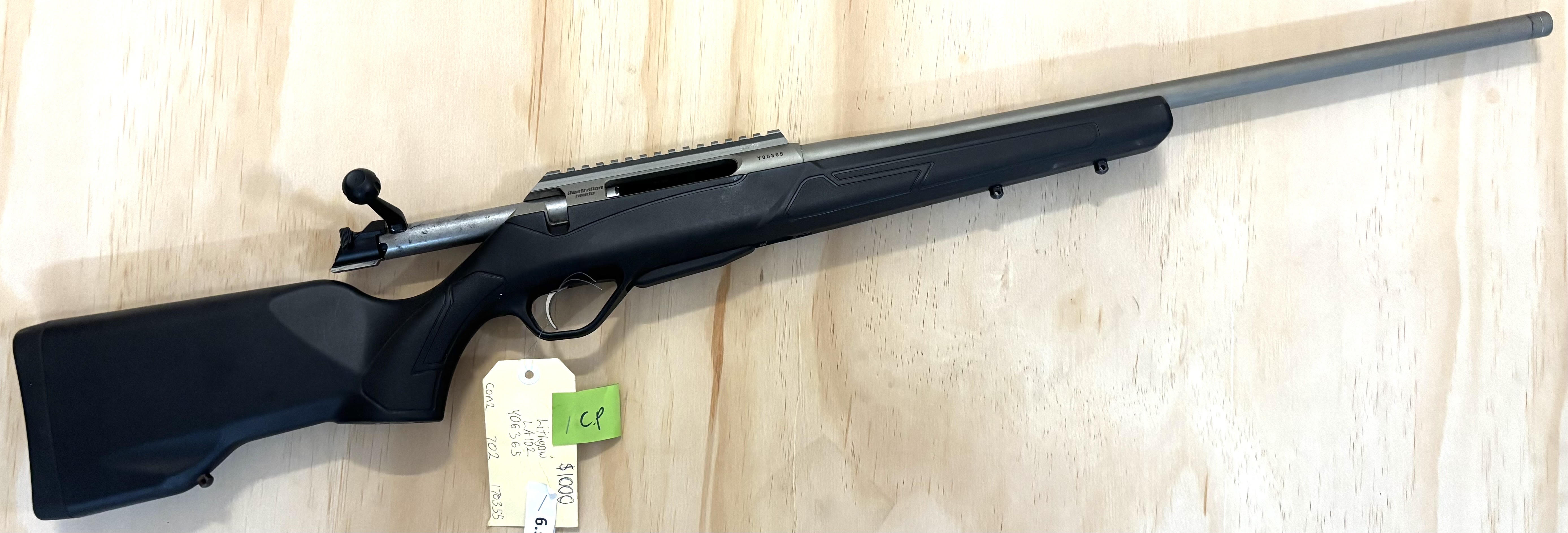 Lithgow LA102 bolt action rifle chambered in 6.5CM in poly stock titanium action & barrel. overall in good used condition with some light tarnishing on the bolt and action.